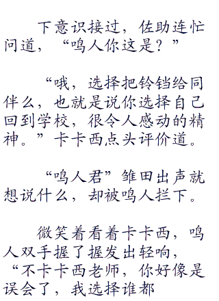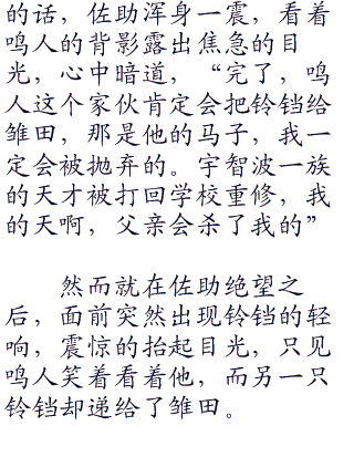 说着,他自口袋中拿出两个铃铛,清脆的铃铛响声回荡,简单的解释过后,并郑重其事的威胁了一番,表示很有可能将他们打回学校重念,在佐助心中留下了不小的阴影。