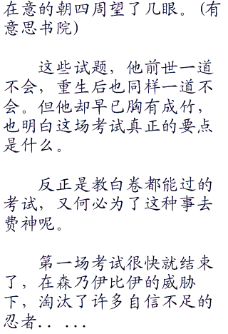 对于今天的木叶来说,这是一个特殊的日子,中忍考试的第一场将在今天举办。