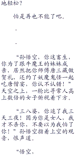 观音超过了秦靖,因为追赶孙悟空,她没的空腾的出手对付秦靖。望着两人渐渐从身边飞过,秦靖凝紧的瞳孔,坚毅的面色没有一丝表情。
