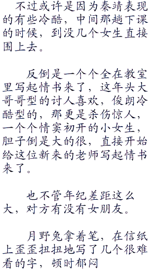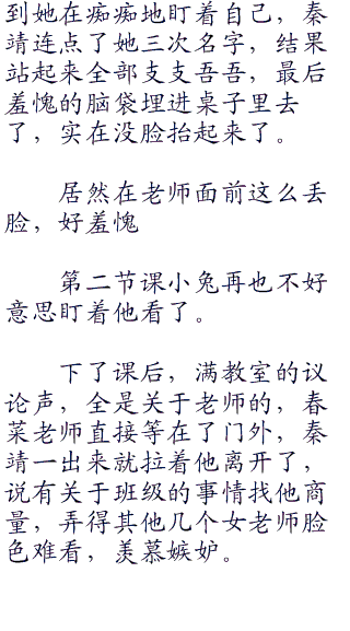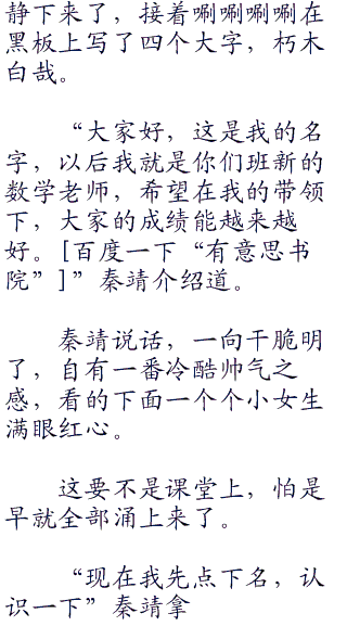 秦靖去的时候,其实第一节课已经开始了,数学办公室里七八个老师,看到秦靖进来,也只是点了个头算是招呼,对秦靖态度极其一般,不过谁让教数学的全都是男老师...