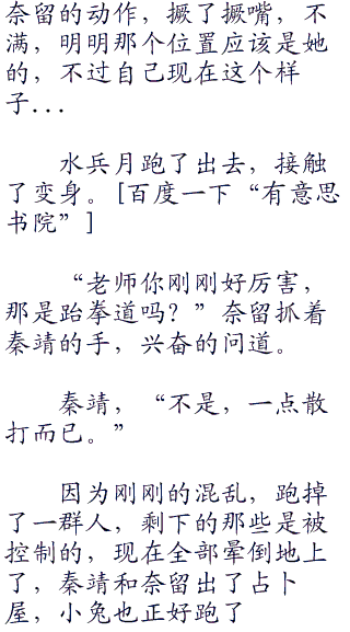 那现在,岂不就是只剩他们两个人了,奈留心中一想脸突然红了一下,偷偷看了眼身旁的秦靖。