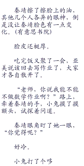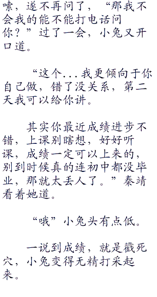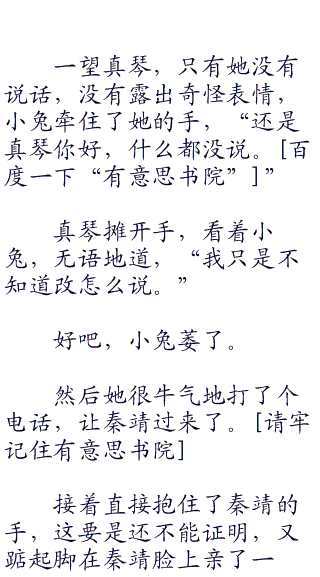 小兔喜欢偷亲他的脸,因为她说他长得很帅,让人就想亲他,不过每次亲到嘴,就被闪开了,秦靖可以接受牵手,亲脸这样亲密的事情,但亲嘴...