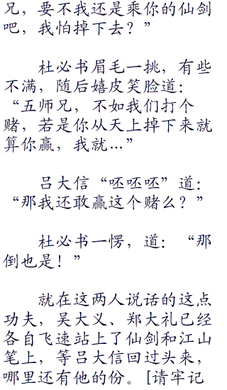 田不易正要踏前,忽然间裤管却被人拉了一下,回头看去,却是被大黄咬住了。只见这只他从小养大的黄狗摇头晃脑,嘴里“呜呜”(咬着裤管)叫个不停,尾巴摇得起劲,一双狗眼更是眨也不眨,直盯着田不易看。