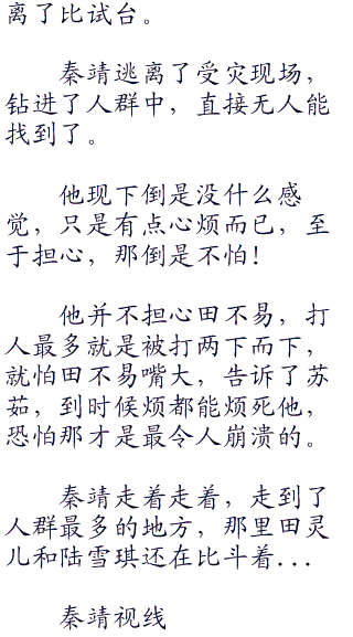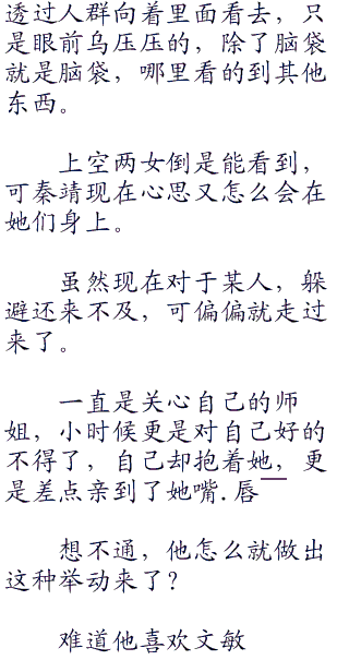文敏看了站在对面的他一眼,他正怔怔地望着自己。略微晕红的双颊,文敏遮掩似地躲避了开去,然后在身边几名小竹峰弟子的搀扶下走下了台,离开了这里。