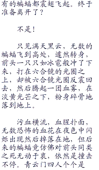 **镜所散发出来的淡黄光芒,此刻显露作用,只见所有的蝙蝠都被隔在那光圈之外,任它们如何撞击挤压,这光圈竟是丝毫不动。