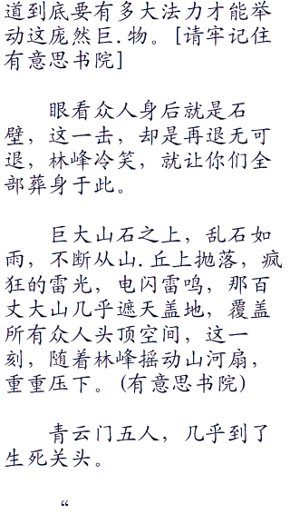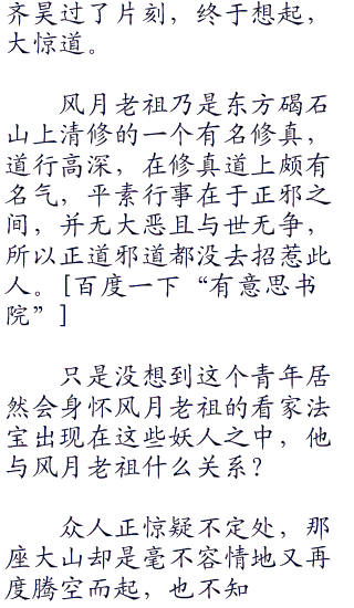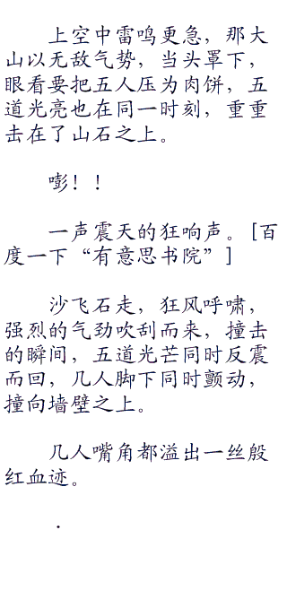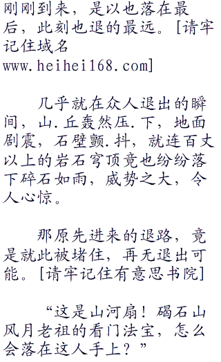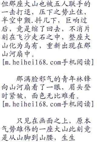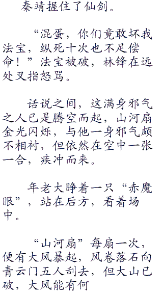 正惊骇处,忽然间一声巨响,只见那把宝扇在半空中一阵颤.抖,片刻之后,那扇中画里的大山竟生生移了出来,见风就长,轰隆声中竟长做百丈之高的山.丘。