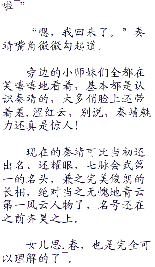 对于这个美丽温柔的师姐,秦靖是很喜欢的,有着自己的主张,却又会将全部的心放在他身上,不得不说,是个很让人心动的女子。