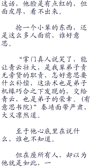 田不易之前那般表情,显然是担心秦靖心里会有什么想法,毕竟这法术不是青云的,是他自己得到的,强行要他交出来,任谁也会不满的。
