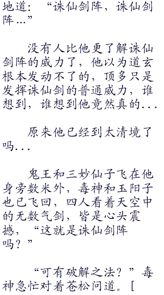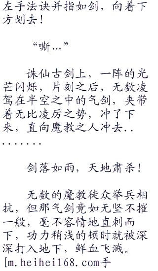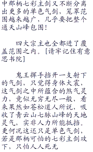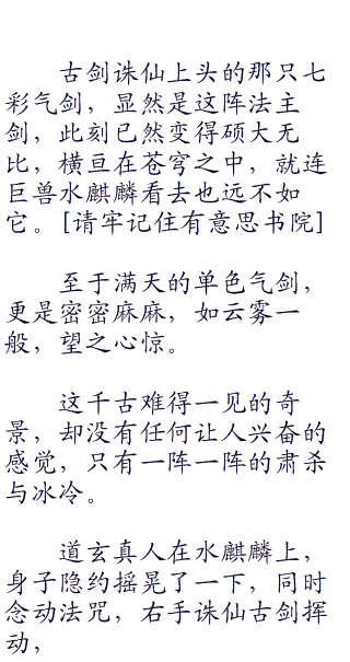 半空中一声巨雷炸响,狂风雄烈,人群中无不变色。通天峰上沙石飞走,尘土飞扬,七道奇光源源不绝,在放射着璀璨光芒的诛仙古剑上方,缓缓出现了一个闪耀着七彩颜色的气剑,不断变大,同时从这主剑之上,不断分离出各色气剑,越来越多,瞬间布满天空,将整个通天峰山头映的七彩流转,美.艳无匹!