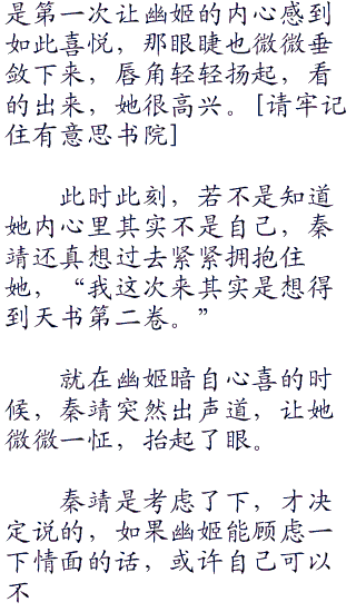 望着坐在对面的幽姬,秦靖忽然很想再看上一眼她面纱下的那张容颜,记忆里,那张美丽的有些失去血色的脸,美的让人惊.艳,美的让人难以忘记...