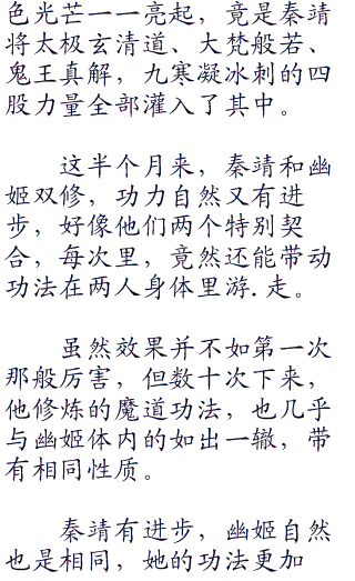 在鬼王宗,秦靖一直呆了半个月,中间进进出出,居然愣是没让人发现,两人断断续续的幽会,便当真幸福似神仙一般。