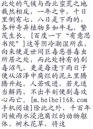 神州浩土,广袤无垠,其中自然以中原大地最为富庶。而在中原之外,北方乃是冰天雪地的极北苦寒冰原,人迹罕至;东方则是浩瀚无边的大海;至于南方,在中原之外有十万大山,耸立边陲,连绵不尽,那里荒山恶水,瘴气毒物不可胜数,传说中更有古怪奇特的奇异荒野蛮人,茹毛饮血,凶残无比。
