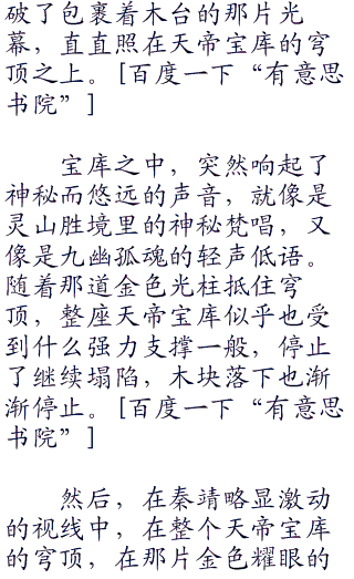 眼看着这座天帝宝库就要崩溃,就在这个时候,仿佛是上古神明的法力,那颗蕴藏神药的杯中,在那奇石之上,突然腾起远比刚才要粗大和耀眼的多的金色光芒,霍然成柱,直冲上天。而这一次,它却是突