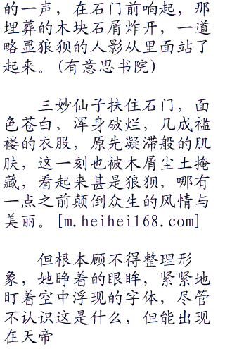 三妙仙子已经被埋在石屑与木块之中了,她的身躯,远没有秦靖那般坚固,甚至作为一个女人,比男子还差一些,不间断的攻击中,让她受了极严重的伤。