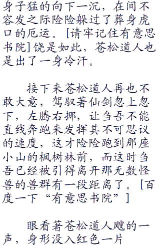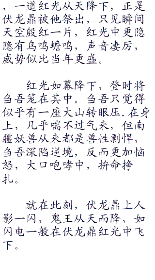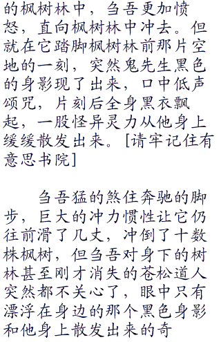 这座无名小山.丘上大都是野生枫树,从天空看下去,红作一片,十分美丽。枫树林前,此刻正站著三男一女,正是鬼王、鬼先生、青龙和幽姬四人。