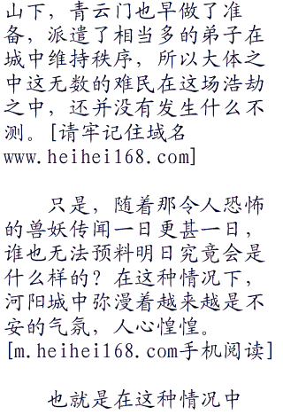 七日之后,青云山周围地界,关于出现兽妖的传闻越来越多,方圆百里之内,以山脚下河阳城为中心,到处都可以见到逃难的人群。仿佛此刻的世间,只有那座巍峨耸立的高大青云山,才能给人一点安慰和安全感觉。
