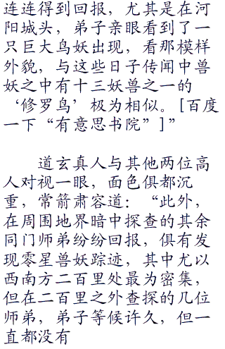一阵强风吹来,巨鸟就这么在兽群上面飘翔过去,一路之上有无数兽妖敬畏的低头闪避,间中遇到同样强大的那几只巨大妖兽,彼此也似互相瞪眼,毫不示弱。巨鸟一路飘翔,身躯也时上时下,或从兽妖头顶掠过,或飞跃树木枝头,有时候遇见一只大的可怖到不可思议的如巨象般的妖兽时,它也直接从巨象妖兽身下穿了过去。