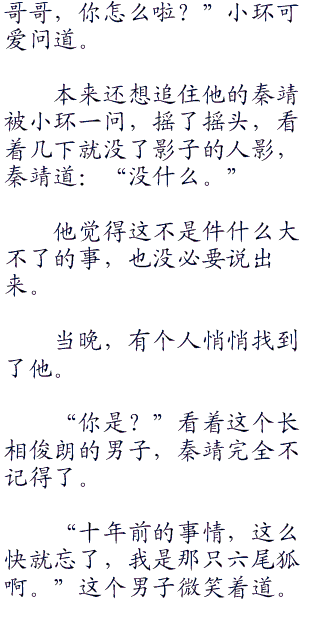 小环用沾了水迹的手帕擦拭着他脸颊上的血迹,淡淡的暗红色随着手帕散开在溪水中,看着男子俊朗的面庞,小环手