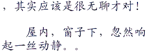 “喂,我想跟你住在一起啊,这里方圆百里之内,连个破庙都没有,喂,这屋子以前的屋主姓什么,或许姓马也说不定啊~!”