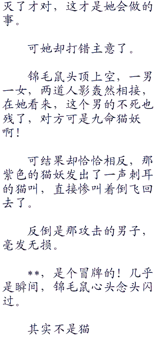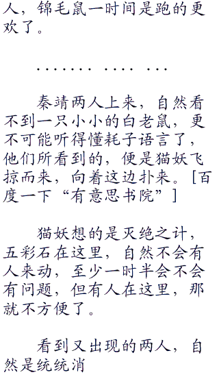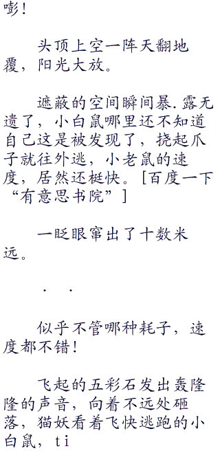 “怎么这么倒霉,遇到一只猫妖!”光芒闪过,原地剩下了一只不足巴掌大的小白鼠在走来走去,最后一个溜身窜到了五彩石的后面,挖洞躲到了下面的石头缝里去了。
