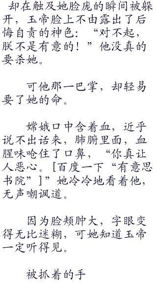 但挥出的瞬间,临到头来想起又连忙撤回了大部分力气,可这挥出的巴掌一时控制不住,依旧生生挥在了嫦娥脸上。
