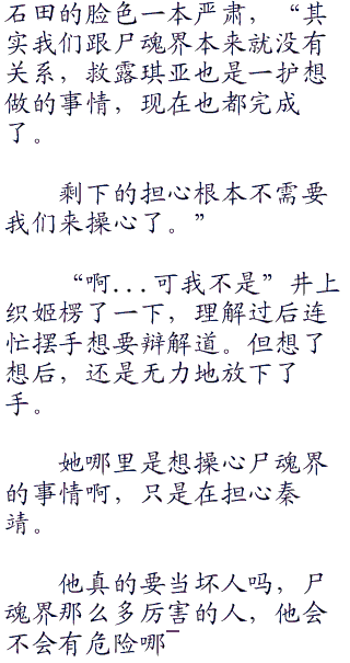“恭喜恭喜了,朽木队长,以后虚圈的领导人就是您了!”市丸银看到场面有些沉重,故作笑声打断道。