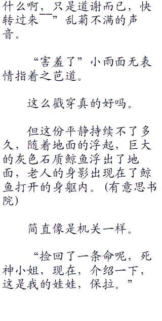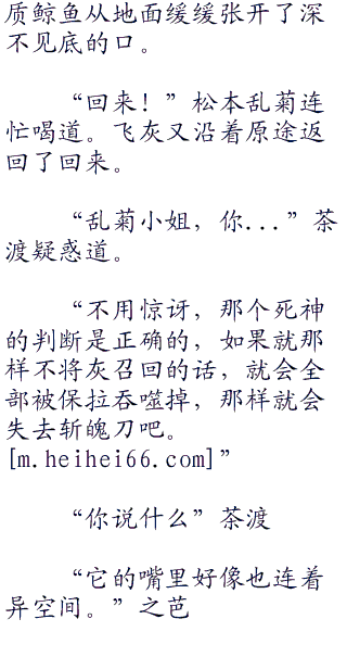 下一秒,灰色泥沙从原地涨开,一道巨大的灰色身影冲出了地面,乱菊身在半空中,猛地抬起了头,背后黑影笼罩的地方,那巨大的灰色身影竟是一只造型诡异的鲸鱼。