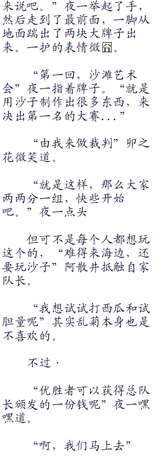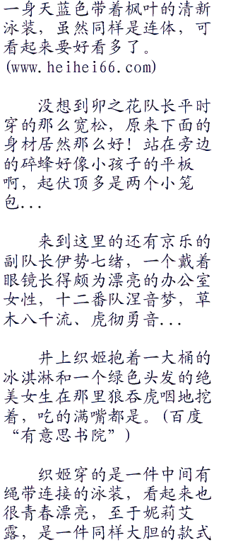 乱菊是小三.角形浅粉色花.瓣的比基尼,而身前的夜一,则是两片略大的橘色布料,野性的蛮腰,微黑的肌肤在阳光下反射着健康的光泽。