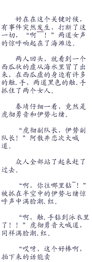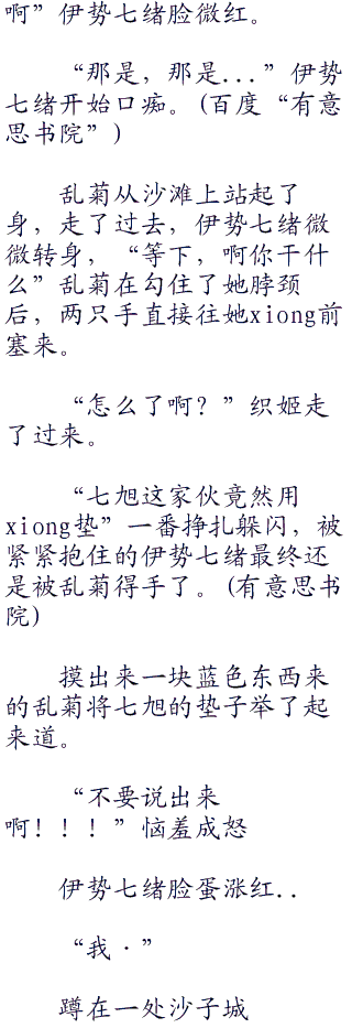 乱菊和织姬面朝着大海,双.腿分开,两个长相同样漂亮的女孩子,正用标准女孩子的跪姿跪坐在沙滩上。