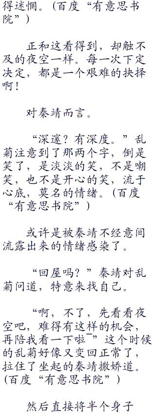 秦靖的思绪在乱菊的声音中慢慢收回,夏日午.夜的凉风让人轻松而舒适,“是啊,夜空很美,只是太深邃了。”