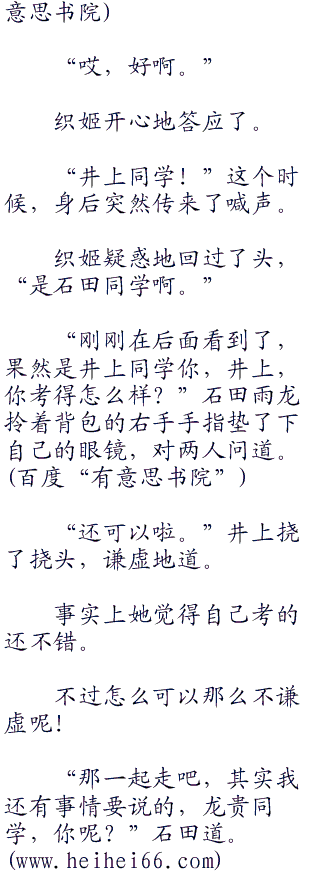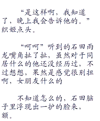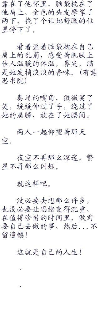 “这夜空真美啊~,是吗,队长。”平淡的语调,淡淡的声音,没有了平时勾.人的感觉,到像是回到了平淡的质朴,乱菊的眉角舒展开轻松的弧度。