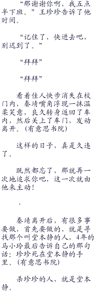 “开个玩笑,只是顺路而已。”“不知道为什么,看到珍珍你,总觉得似曾相识呢,很亲近的感觉。”秦靖语气柔声道。