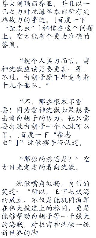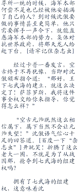 本来打算等着上任海军元帅一职时,再以此来揽功绩。不曾想,这个设想却提前被别人说了出来。基于王下七武海的想法只是战国在脑子里考虑过,而从未向外人提及。所以面临眼下这番情况,他甚至除了简单的表示支持以外,不能多提任何其他。