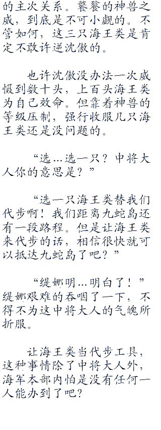 “什么?无风带?我们为什么要通过无风带去往九蛇岛?难道你不知道无风带是海王类出没最频繁的地方吗?”缇娜一脸严厉的教训道。不得不说,这种以长官的身份,随意教训下属的感觉很让她感到陶醉。