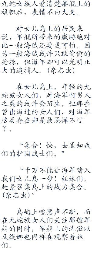 或者说是女儿岛,亚马逊.百合作为海贼王世界中的神秘岛屿,女性战斗名族“九蛇族”的国家,顾名思义这是一座只有女人居住的岛,她们与生俱来就被当成战士培育,一肩扛起所有家计和劳力,连怀孕后也只生下女孩。特色是身上都缠着一条蛇,拥有随意变换成武器的能力。国家被建在被丛林覆盖的高山中,岛上有着数百年前“男人禁令”的绝对规范,男人一旦进入此地,下场就是被消灭。