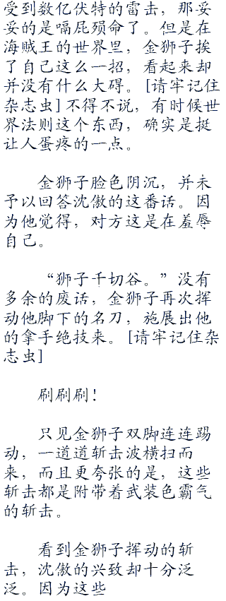 一剑斩下去的时候,却被金狮子以右脚上的名刀抵挡了下来。紧随之金狮子迅速扭动着他的身体,另一脚冲着沈傲直逼而来。
