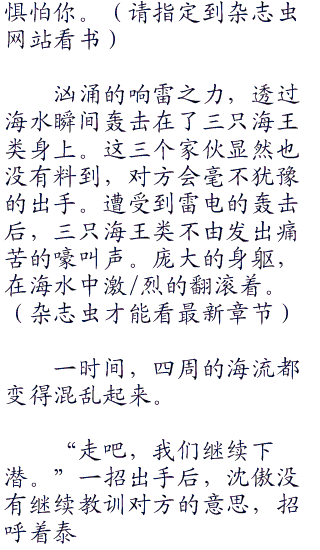 “有意思!这是要给我来一个下马威的节奏吗?”迎着三只巨大的海王类,沈傲嗤笑了一声。紧接着,他身上勃然释放出无边的电流,就这么顺着海流朝三只海王类轰击过去。
