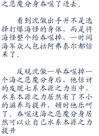 反观沈傲一举吞噬掉一个海之恶魔分身后,他惊讶的发现七系本源之力当中,水系本源之力居然了不小的滋养与提升,顿时他乐呵了。吞噬这海之恶魔分身居然可以让自己水系本源之力提升?那还等什么?
