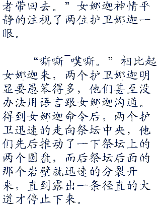 “嘶嘶~噗嘶。”相比起女娜迦来,两个护卫娜迦明显要愚笨得多,他们甚至没办法用语言跟女娜迦沟通。得到女娜迦命令后,两个护卫迅速的走向祭坛中央,他们先后推动了一下祭坛上的两个圆盘,而后祭坛后面的那个岩壁就迅速的分裂开来,直到露出一条径直的大道才停止下来。