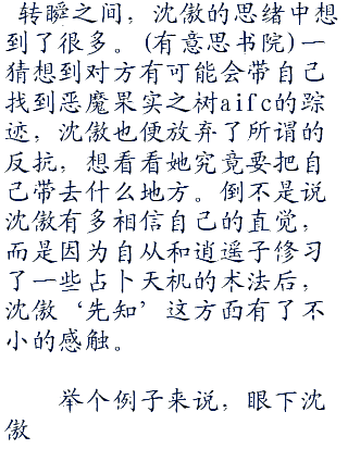 转瞬之间,沈傲的绪中想到了很多。一猜想到对方可能会带自己找到恶魔果实之树aifc的踪迹,沈傲也便放弃了所谓的反抗,想看看她究竟要把自己带去什么地方。倒不是说沈傲多相信自己的直觉,而是因为自从和逍遥子修习了一些占卜天机的术法后,沈傲‘先知’这方面了不小的感触。