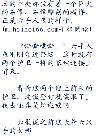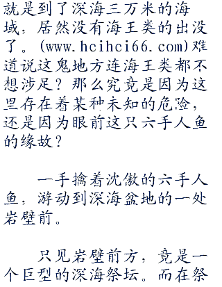 只见岩壁前方,竟是一个巨型的深海祭坛。而在祭坛的中央部位着一个巨大的石像,石像雕刻的模样,正是六手人鱼的样子。