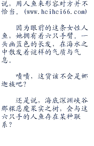 因为眼前的这条女性人鱼,她拥着六只手臂。一头幽蓝色的长发,在海水之中散发着谜样的气质与气息。