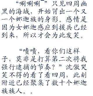 “唰唰唰~”只见四周幽黑的海域,开始冒出一个又一个娜迦族的身影。感情是因为女娜迦感应到援兵已经到来,所以才会为此发笑。