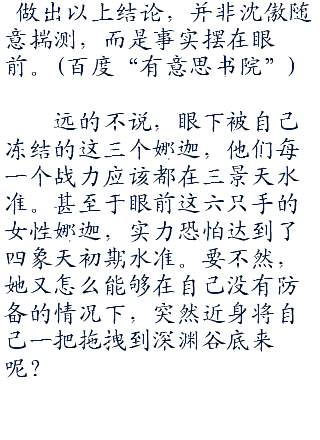 远的不说,眼下被自己冻结的这三个娜迦,他们每一个战力应该都在三景天水准。甚至于眼前这六只手的女性娜迦,实力恐怕达到了四象天初期水准。要不然,她又怎么能够在自己没防备的情况下,突然近身将自己一把拖拽到深渊谷底来呢?
