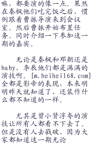 听到baby的话,曾小贤点了点头说:“baby说的也对啊!上一次枫哥直接就把baby给out了。虽然枫哥的演技那么好,但是baby肯定就没有那么好的演技了!”
