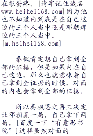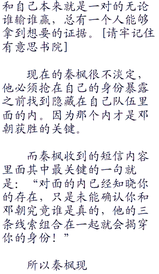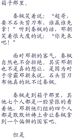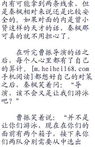 也就是说如果他们能够在每轮游戏中获胜的话,他们就有可能得到线索。想到自己要带着三个对手和自己的队友争夺线索,邓朝脸上露出了无奈的表。不过显然邓朝并不知道也没有丝毫怀疑过秦枫就是内。