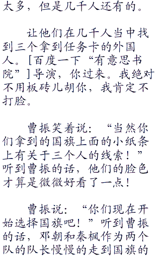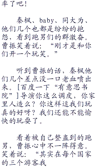听到曹振的话,跑男们都是心中一喜,邓朝唯恐被人看穿,所以邓朝并没有过多的疑问,因为邓朝和秦枫都知道自己的短信内容和其他人的短信内容一样。