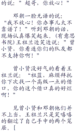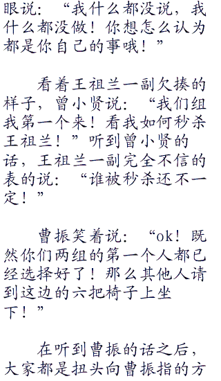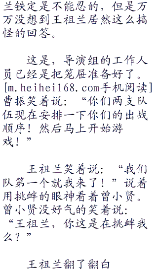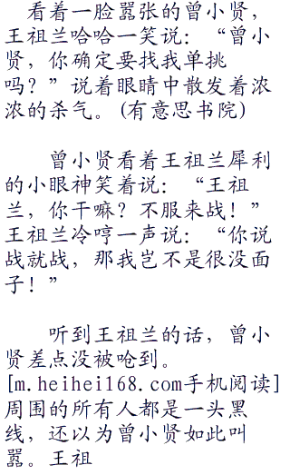曾小贤不服的翻着白眼对着王祖兰笑着说:“王祖兰,我要找你单挑!你敢来吗?”说着曾小贤的眉毛跳起了舞。
