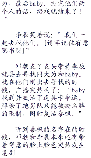 广播传来:“秦枫out!由于秦枫out,所以本期节目的真正主题暴露。现在邓朝和他安插在跑男队的内已经取得主动权。