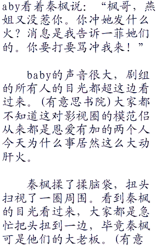从早上开始大家就发现baby和秦枫两个人有问题。别人不知道,邓超很清楚秦枫身边一共有多少个女人。所以邓超也知道baby是有多么的大度才能容忍下去。但是今天一大早从吃早餐开始baby就一脸寒意,而秦枫则是一脸的无奈。显然两个人闹矛盾了。